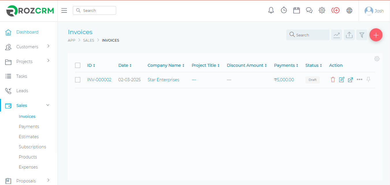 1. Invoices OverviewRoz CRM makes getting paid by your clients very easy and efficient. You are able to bill your customers in a variety of ways. From one -time invoices to recurring invoices, we have made the process easy and intuitive.