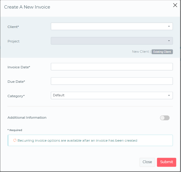 2. Creating InvoicesRoz CRM allows you to easily manage your invoices. You are able to create one-time invoices or recurring invoices. The next sections will explain how to create either type of invoice.