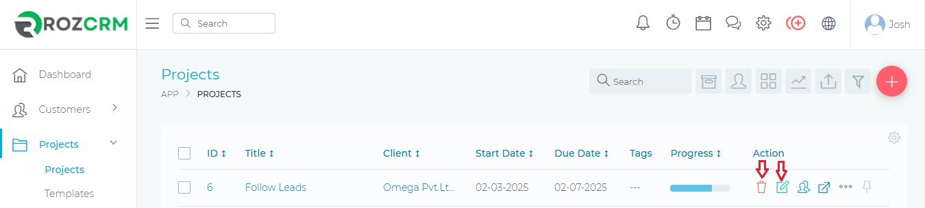 Deleting A ProjectTo delete a project, click on the Delete Icon, as shown in the image below: